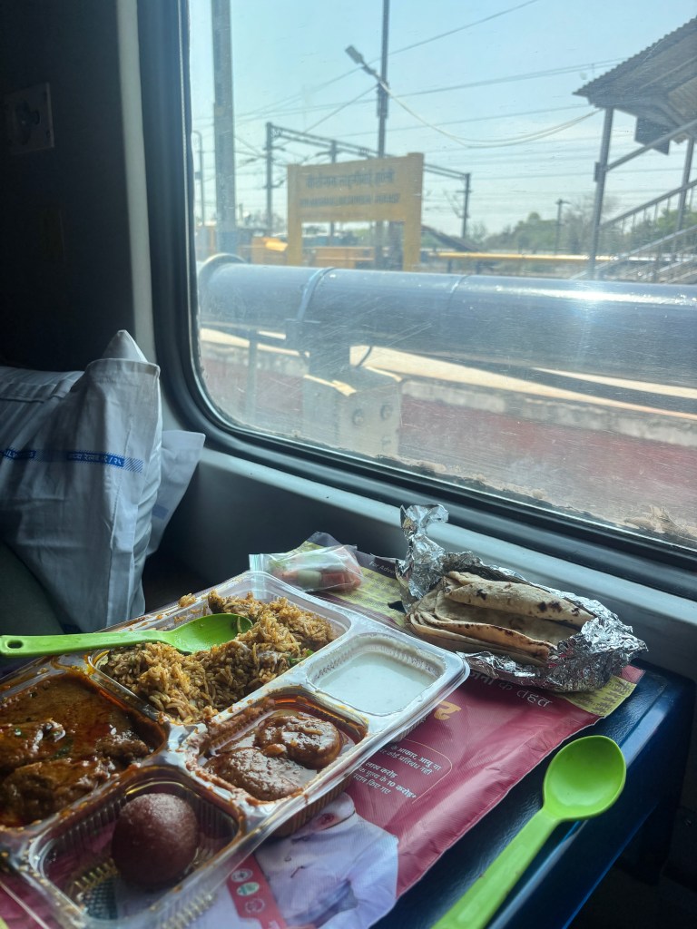 At Jhansi, we were delivered our lunch which we ordered through the IRCTC app. An ensemble of rice, Indian bread, chicken, eggs, curd, etc aptly called ‘Maharaja Thali’ that could have fed more than two.