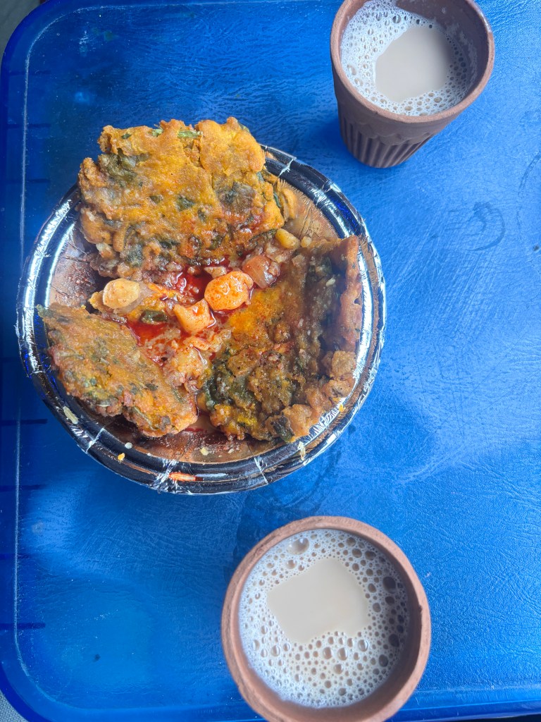 This time, our coach aligned perfectly with a food stall. Kulhad chai and pakoda chaat beckoned irresistibly. Spinach-laced fritters, tangy tamarind chutney, chickpeas—it was earthy, indulgent, unmistakably Bhopali.