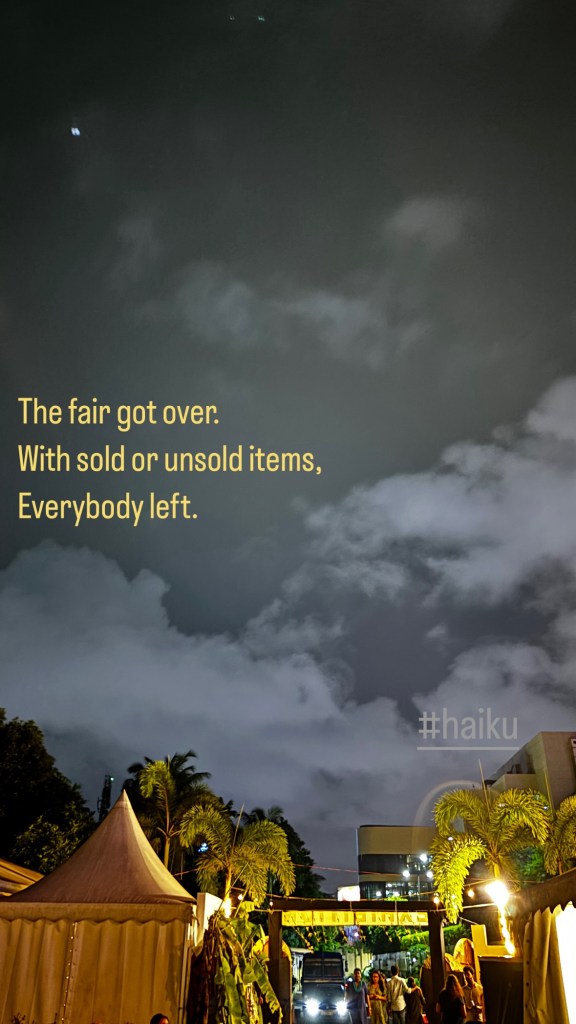 The fair #haiku The fair was in the makingWith tents, wares and bannersFilling the bland venueAttractive goodsArrived in truckloads Glittering and mouth watering Shining and newEach pricedBeyond their valueSeeking Beyond what’s dueThen arrived the peopleIn swarms like beesSeeking the wantsMuch beyond their needsIn their convergenceLay the war of needsevery transaction foughtwith the deadly arsenal of greedIn the end The time was upThere were some goods unsoldAnd some wants unfulfilled The fair was overEach one leftLoading the unsold or soldFilling the trucks once again till the very brimWhat remained Was the empty bland venueSilent witness of the spectacle Oft repeated in its bosom For the trucks will once again arriveWith the unsold and unfulfilled Creating the wants and greedWhere there was noneFair is in makingonce again at the same venuewhich remained alwaysbland and new